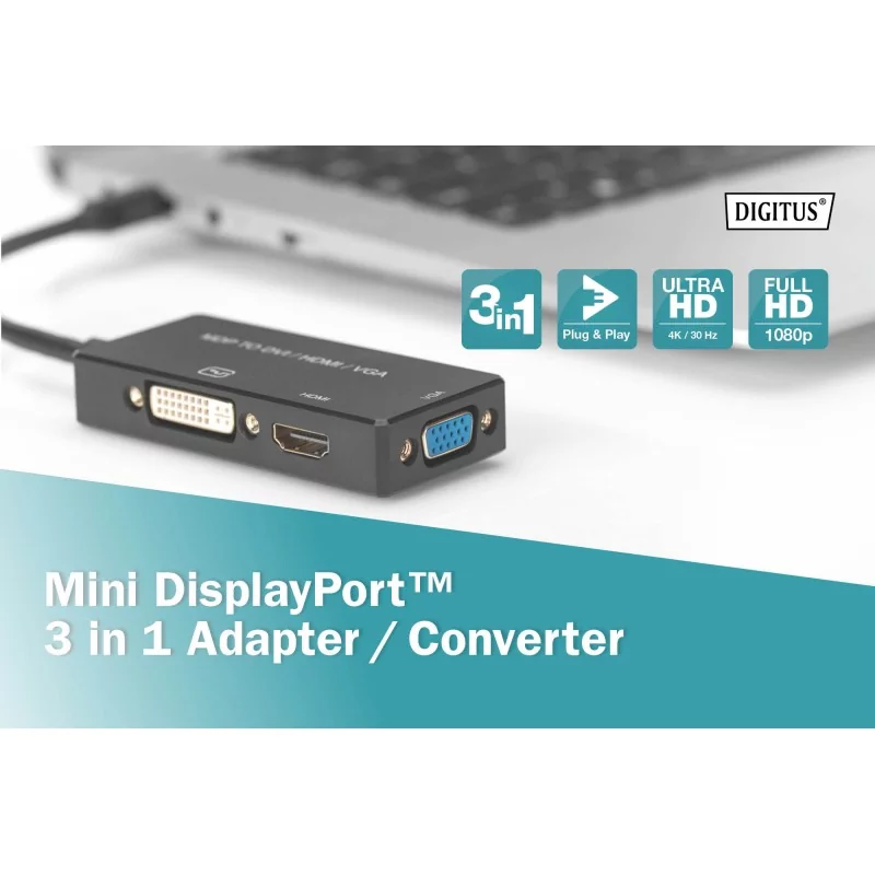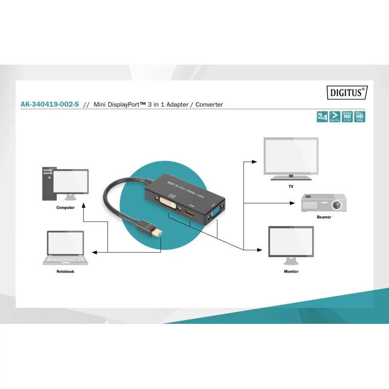 Korzystaj z urządzeń HDMI, DVI lub VGA podłączonych za pośrednictwem kabla DisplayPort. Zrezygnuj z używania 3 osobnych adapterów i zacznij korzystać z tego kabla konwertującego 3 w 1.