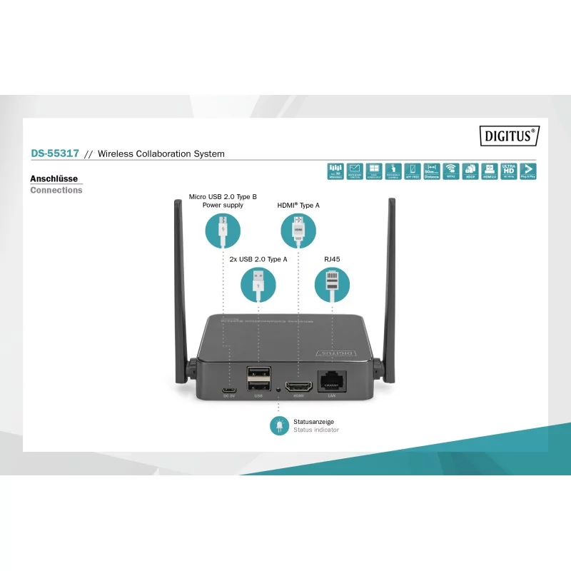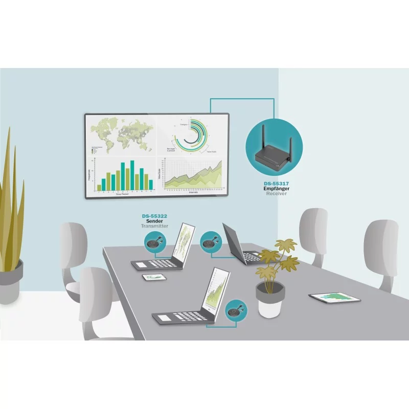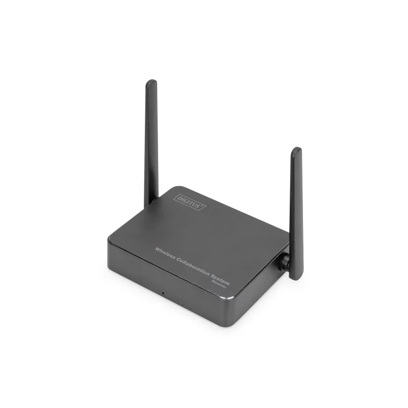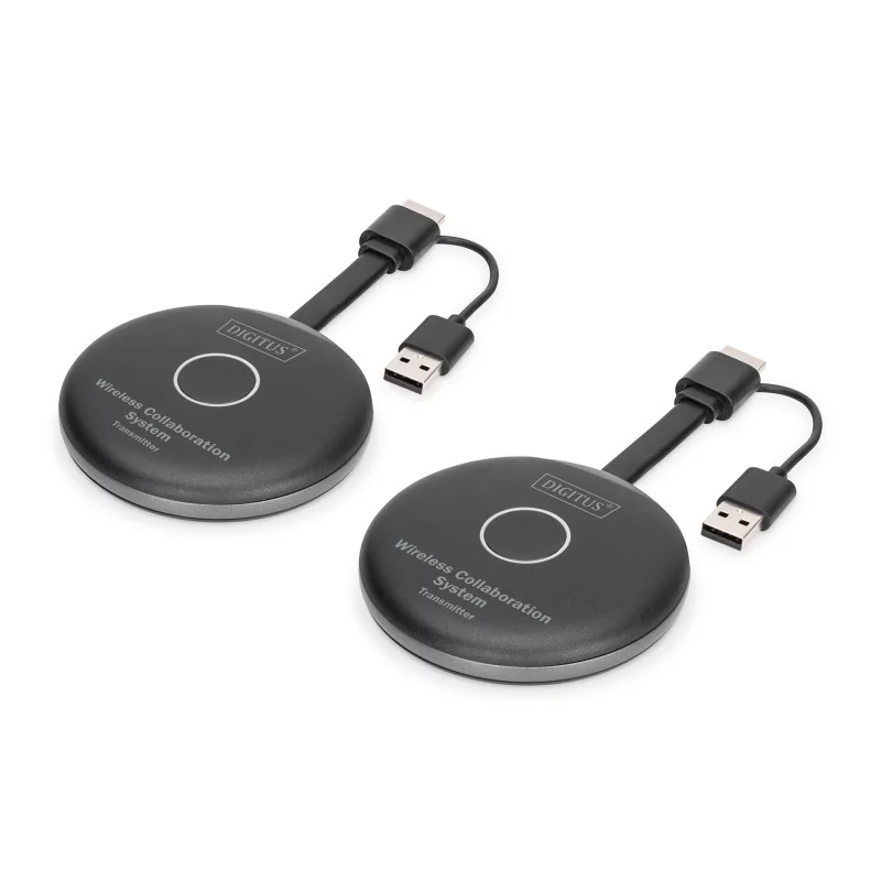 Bezprzewodowy system współpracy (Wireless Collaboration System) marki DIGITUS® łączy ze sobą wszystkie Twoje urządzenia (notebook, tablet, smartfon) i stanowi sprzętowe rozwiązanie do prezentacji. Umożliwia bezprzewodową transmisję treści z ekranu do sal konferencyjnych. Maksymalnie 30 uczestników może połączyć się z odbiornikiem. Możliwość prowadzenia prezentacji / pracy zespołowej przez maksymalnie 4 uczestników jednocześnie na podzielonym ekranie. Notebooki można podłączyć za pomocą transmitera HDMI, a ponadto cały zestaw można rozszerzyć o dodatkowe transmitery (DS-55322). Alternatywnie, strumień bezpośrednio z notebooka (bez TX) poprzez bezprzewodowy ekran (Windows)/synchronizację ekranu (macOS) do odbiornika. Treści z tabletu/smartfona można łatwo udostępniać za pomocą funkcji Sharing/Cast (dla systemu iOS, iPadOS/Android) urządzenia mobilnego. W tym celu należy najpierw połączyć urządzenie mobilne z odbiornikiem (SSID) przez sieć WLAN. Konfiguracja systemu została w tym przypadku maksymalnie uproszczona – nie jest wymagane żadne dodatkowe oprogramowanie/aplikacje. Rozwiązanie umożliwia zwiększenie efektywności prowadzenia konferencji, oszczędza czas i optymalizuje osiągane wyniki. Udostępnianie – prowadzenie prezentacji – praca zespołowa.
