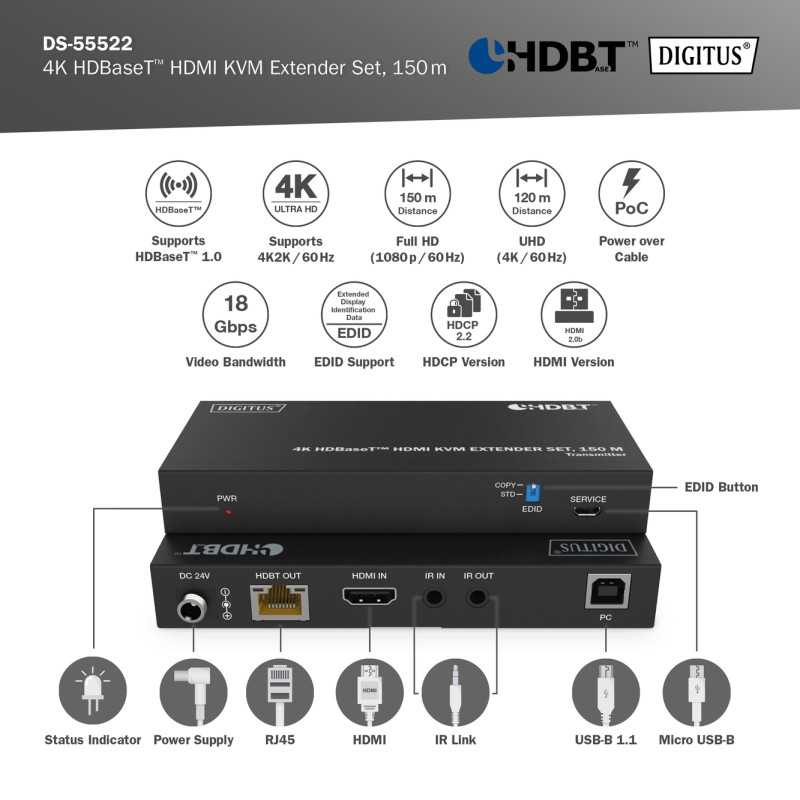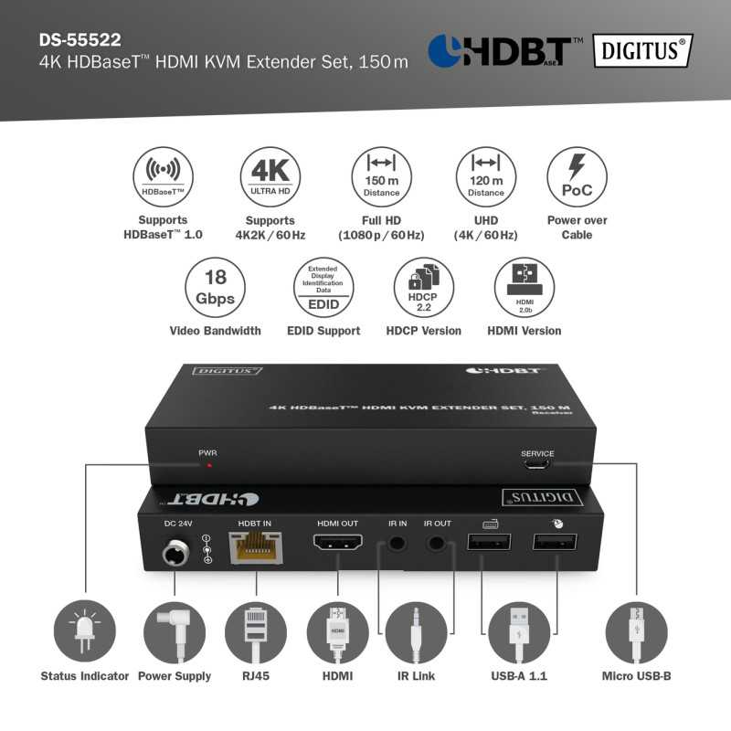 Przedłużacz/Extender HDMI 4K60Hz 150m po skrętce HDBaseT HDCP2.2 IR EDID PoC(Power over Cable)zestaw DS-55522