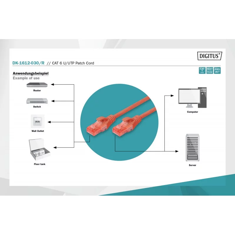 patch cord RJ45/RJ45 U/UTP kat. 6 7,0m AWG 26/7 PVC czerwony DK-1612-070/R Digitus Professional