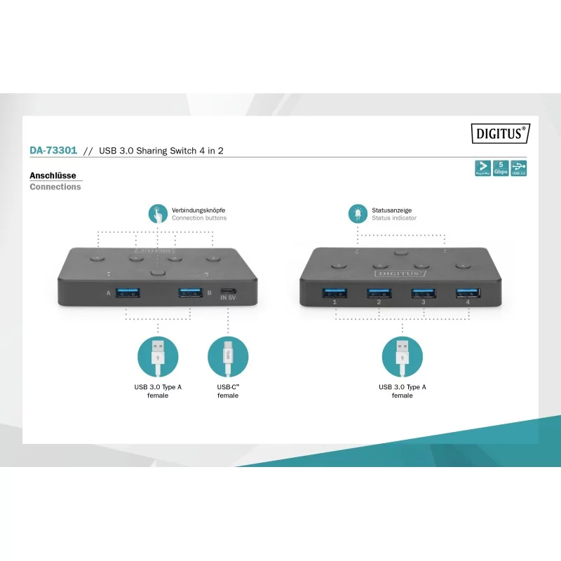 Przełącznik USB 3.0, 2 PC - 4 Urządzenia, zasilanie USB C DA-73301