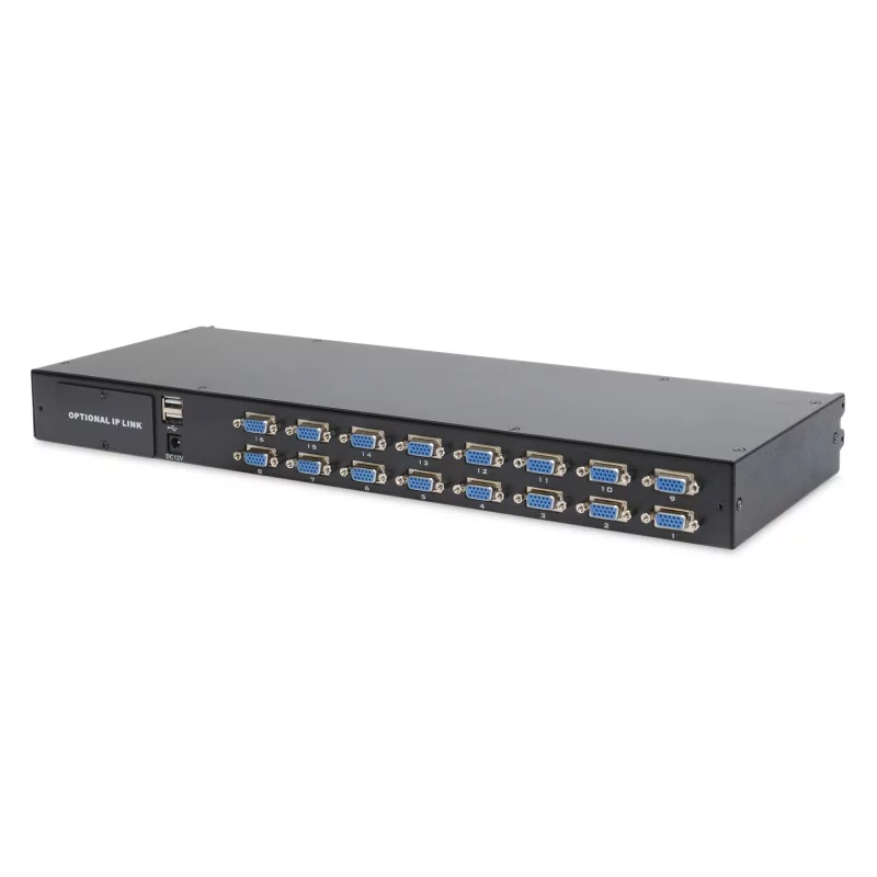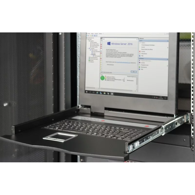 - Konsola modułowa z monitorem TFT o przekątnej 17″ (43,2 cm), 16-portowym przełącznikiem KVM & touchpadem, klawiatura amerykańska