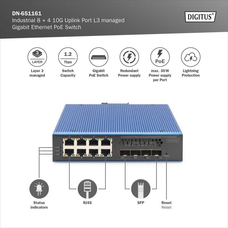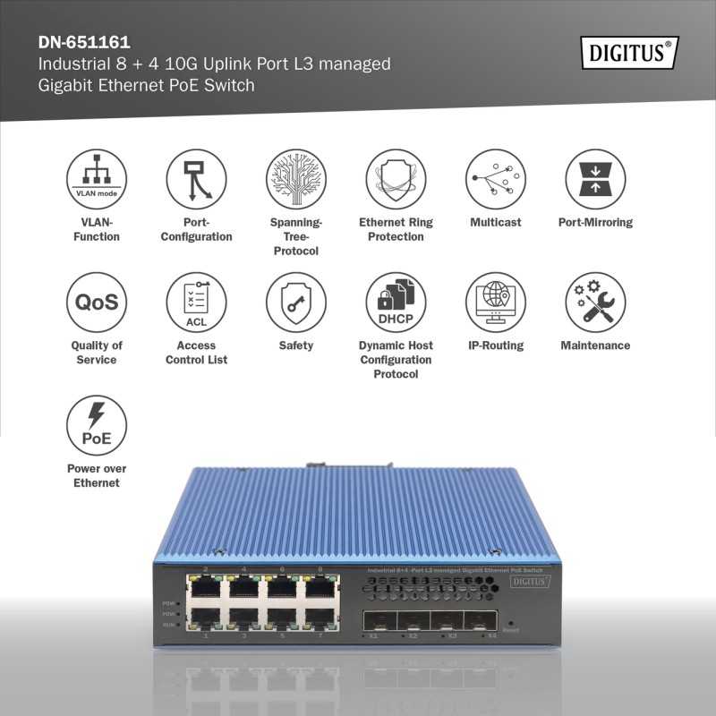 DIGITUS Przemysłowy 8 + 4 porty 10G uplink L3 zarządzany przełącznik Gigabit Ethernet PoE DN-651161